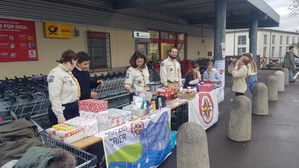 Hierfür haben wir uns jeweils einen ganzen Samstag mit der fleißigen Unterstützung unserer Pfadfinder vor den Edeka in Feyen-Castelnau sowie Kaufland in Trier West gestellt und Einkäufer vor Ort motiviert, einzelne Waren einzukaufen und für die Weihnachtskartons zu spenden.